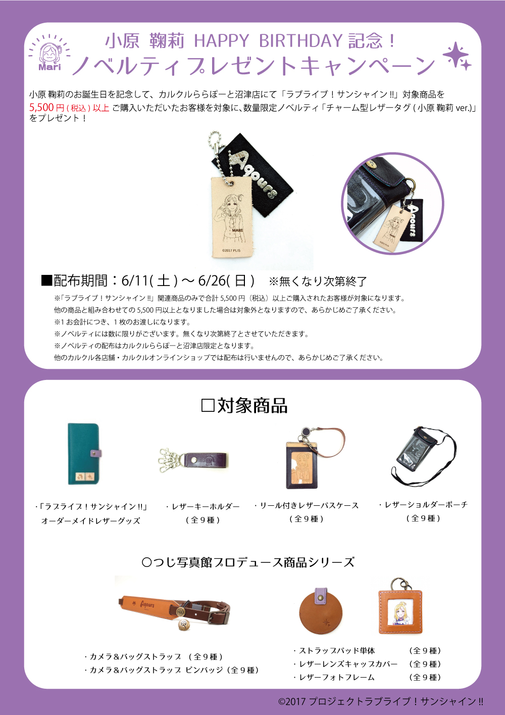 小原鞠莉のお誕生日を記念して、カルクルららぽーと沼津店にて「ラブライブ!サンシャイン!!」商品を5,500円(税込)以上ご購入いただいたお客様を対象に、